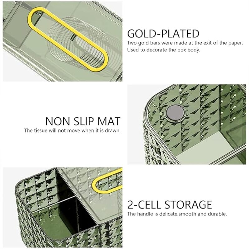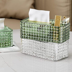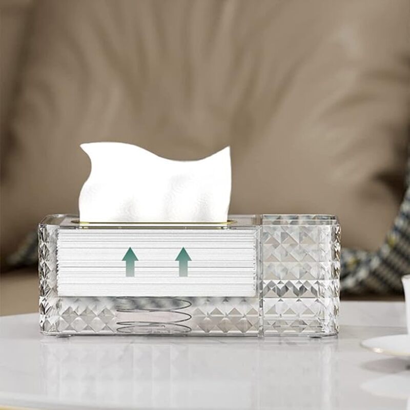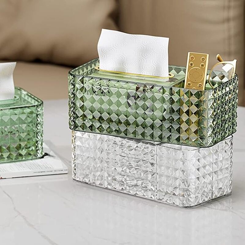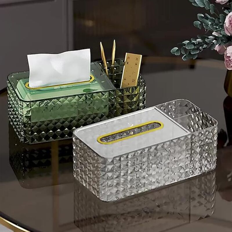 Add elegance and functionality to your space with the Diamond-Cut Spring-Rise Tissue Box with Dual Compartments. Designed with a crystal-inspired diamond-cut texture, this organizer combines a spring-loaded tissue dispenser with two side compartments for storing essentials like remotes, glasses, or cosmetics. Stylish and practical, it keeps your tabletop neat while adding a luxurious accent to any room.