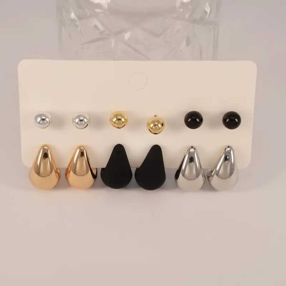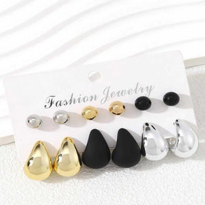 Upgrade your jewelry essentials with the Everyday Elegance 6-Pair Earring Collection. This curated set includes a balance of chic studs and bold water-drop designs in classic gold, silver, and black finishes—perfect for mixing, matching, and styling effortlessly every day.