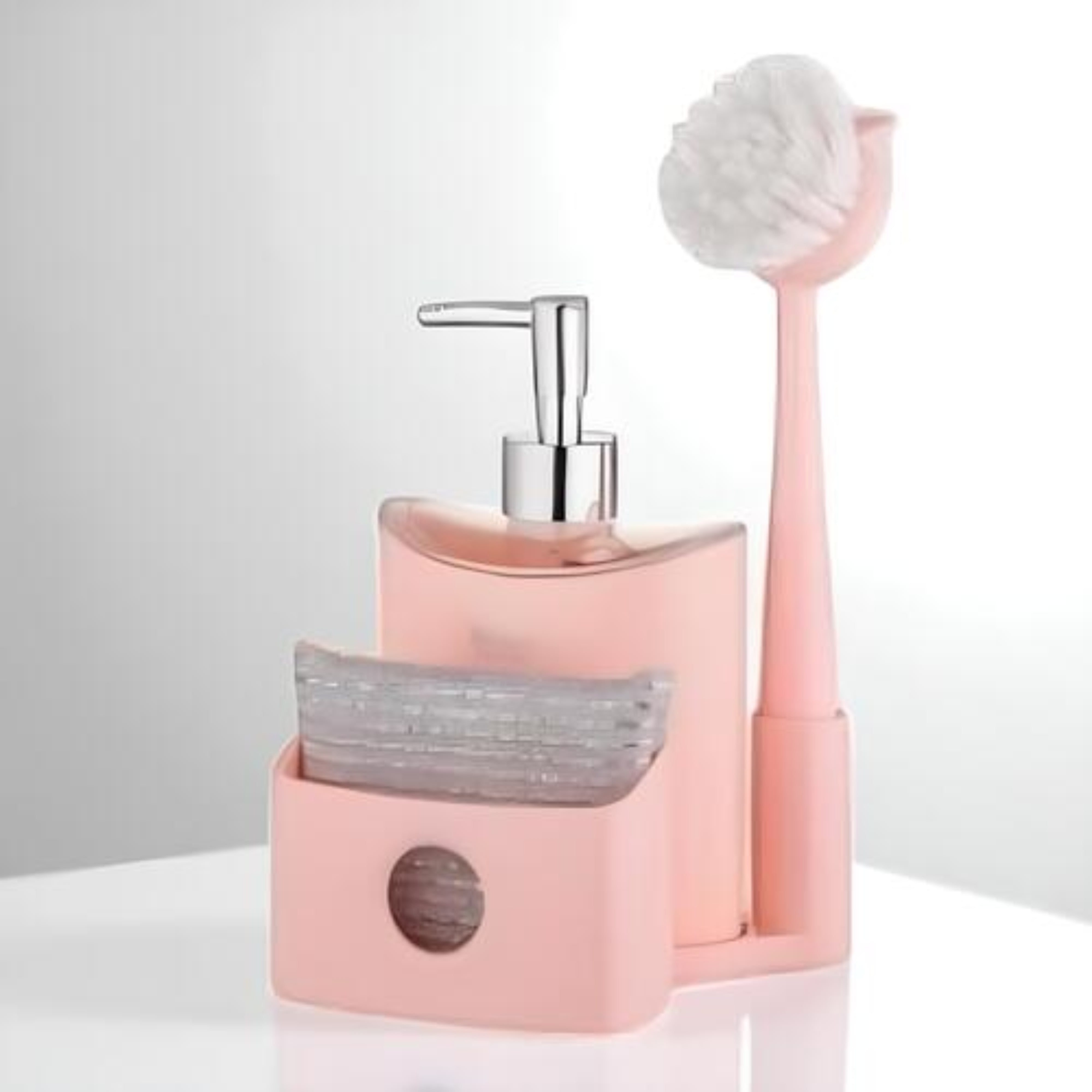 Complete 3-in-1 Set: Includes a liquid dispenser, a cleaning brush, and a sponge, providing all essential dishwashing tools in one unit.