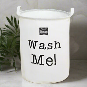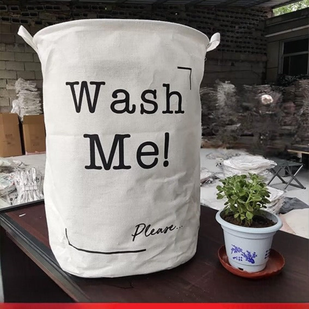 The "Wash Me!" Reminder Foldable Laundry Basket is a practical and stylish storage solution for any home. It features a cylindrical design with two sturdy handles for easy carrying and a bold "Wash Me!" message printed on the front. The basket is crafted from a durable, lightweight fabric, likely cotton or canvas, and is designed to fold flat for convenient storage when not in use. Its neutral color and minimalist design make it suitable for a variety of interior styles.