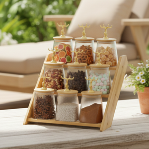 • Stylish bamboo stand keeps jars organized and accessible