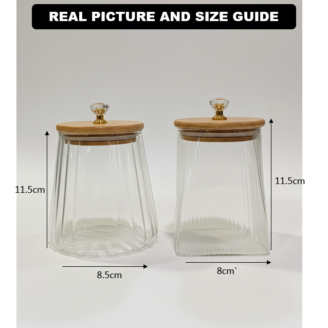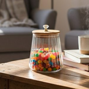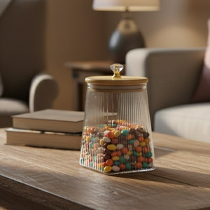 Upgrade your kitchen organization with the Ribbed Airtight Glass Jar with Bamboo Lid & Crystal Knob. Crafted from premium clear ribbed glass, this jar combines elegance with everyday functionality. The natural bamboo lid features a crystal-style knob and an airtight silicone seal to keep contents fresh for longer. Its modern yet timeless design makes it perfect for both storage and countertop display