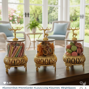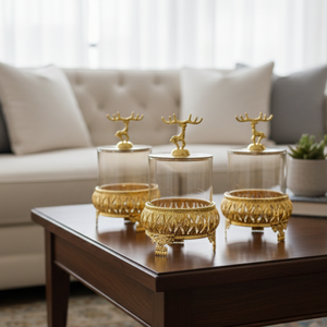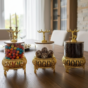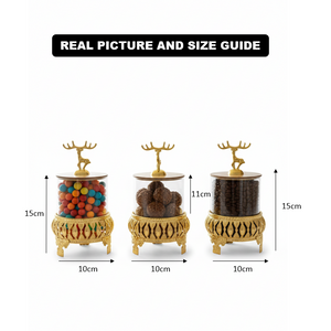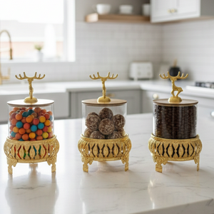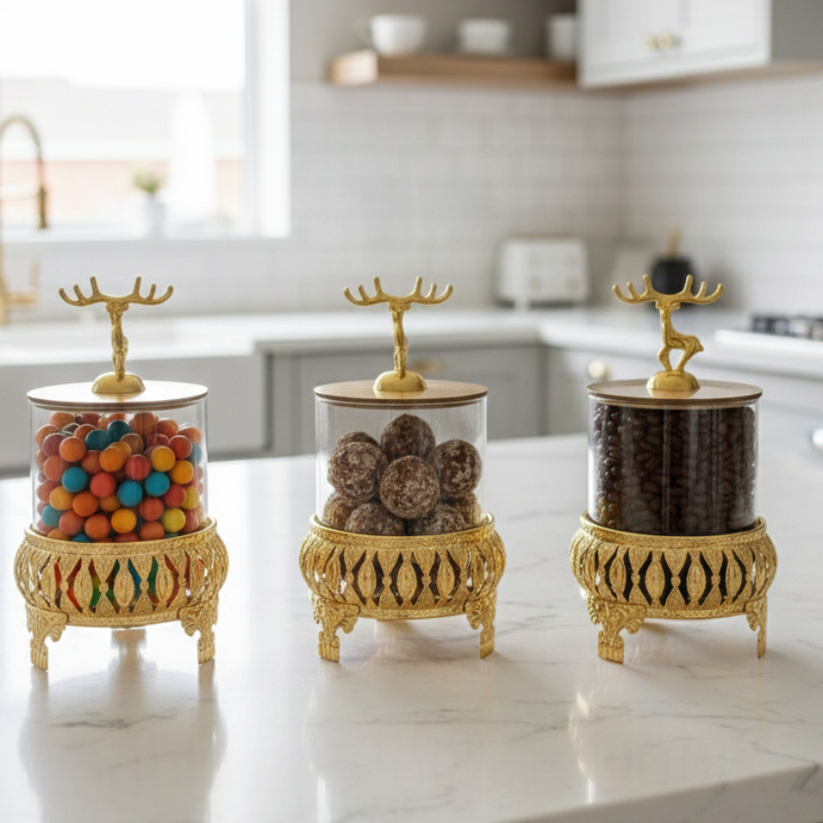 Add refined elegance to your kitchen or dining space with the Royal 3-Pcs Golden Base TintedGlass Jars with Lid (1129). Designed with a luxurious golden base and decorative deer-inspired lids, this premium jar set blends functionality with statement décor. Each jar offers generous storage for dry foods while keeping contents visible and fresh. Perfect for countertops, pantries, or stylish gifting, this set elevates everyday storage with a sophisticated touch.