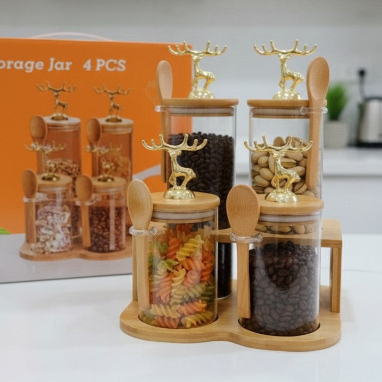 TintedGold 4-Pcs Airtight Storage Jars Set (1105) with Bamboo Spoon & Stand
