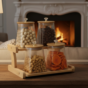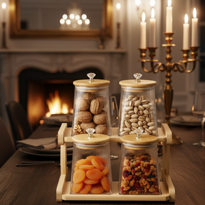 The WoodCrest Ribbed & Tinted Glass Display is a perfect blend of natural elegance and everyday functionality. Each jar is made from high-quality clear glass, allowing easy visibility of contents, and topped with a natural wooden lid that creates an airtight seal to keep food fresh. The set is completed with a matching wooden stand, offering organized storage while adding a warm, modern touch to your kitchen or pantry. Designed for both practicality and aesthetics, this set is ideal for modern homes that value style and organization.