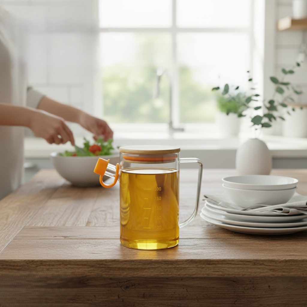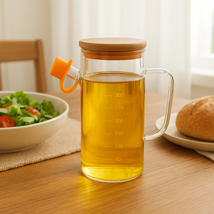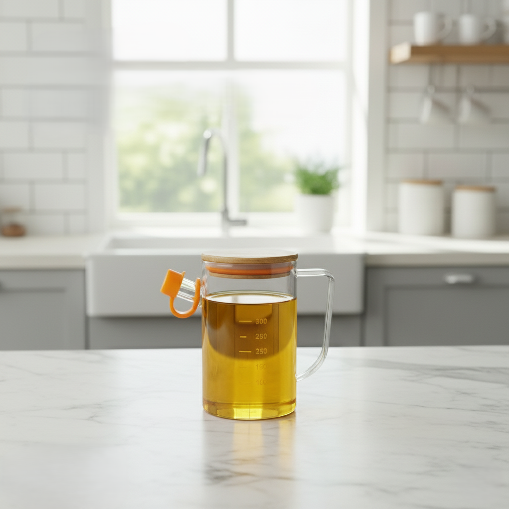Keep your kitchen clean, stylish, and efficient with the SafePour Glass Oil Dispenser — designed for precise, drip-free pouring and everyday convenience. Made with high borosilicate glass, it ensures durability and resistance to heat, making it ideal for cooking oils, vinegar, or soy sauce. The airtight wooden lid with a silicone seal keeps contents fresh, while the ergonomic handle and precision spout ensure total control with every pour. Its clear body allows you to monitor oil levels easily, combining functionality with modern minimalism.
