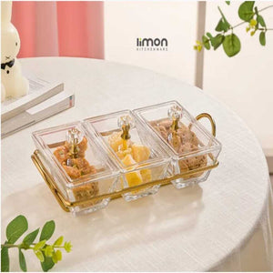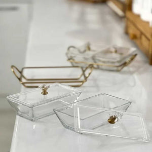 Elevate your hosting and serving experience with the Signature Rectangular Snack Serving Tray Set by Limon. Designed with sophistication and practicality in mind, each set features transparent glass trays with stylish acrylic lids, placed on a sleek metallic base. Whether serving snacks, sweets, or dry fruits, these versatile trays add elegance and functionality to any occasion.