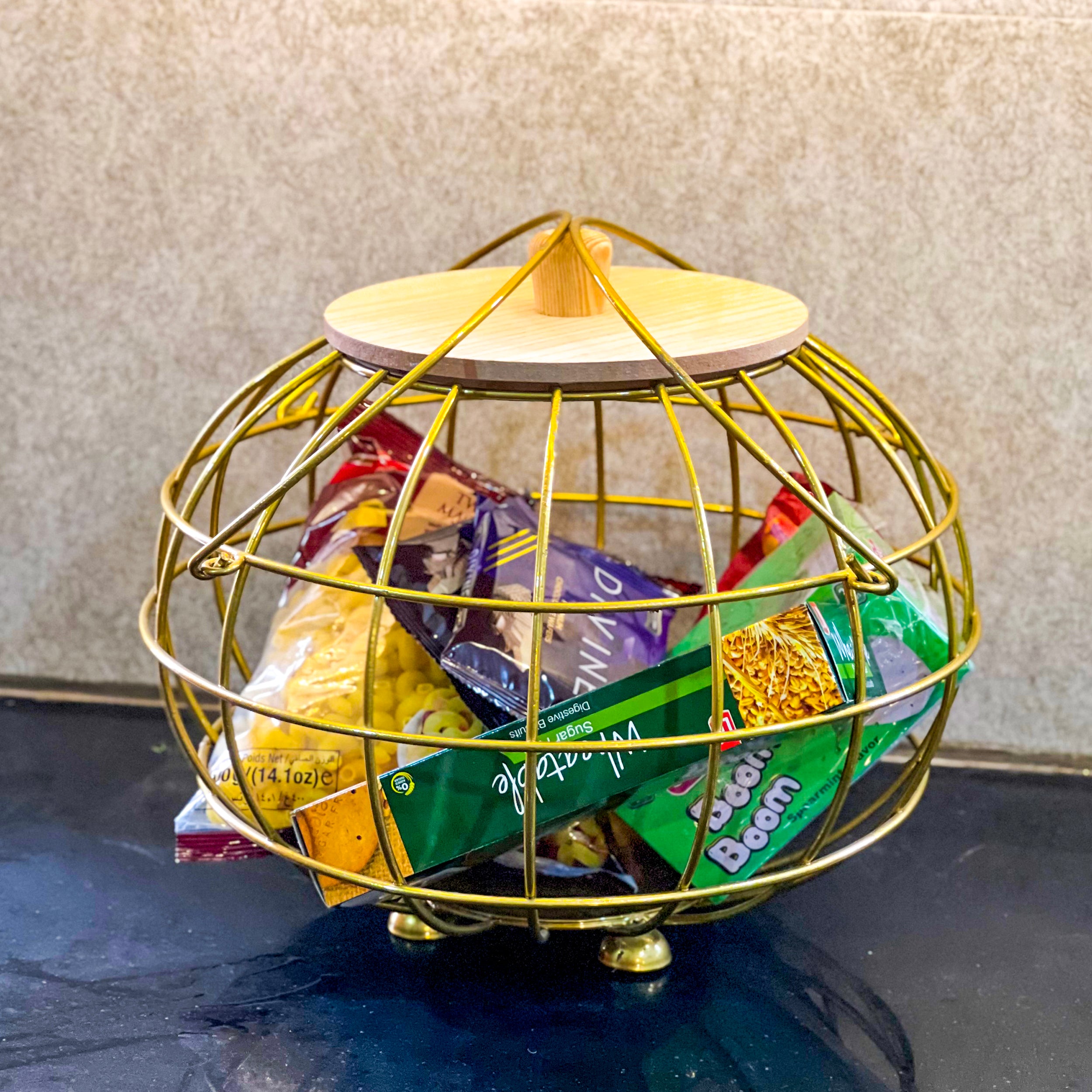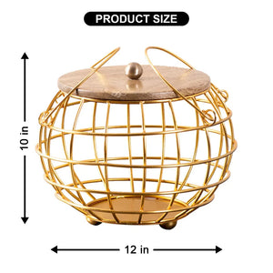 Add a touch of modern elegance and functional artistry to your home with the Golden Multipurpose Basket with Wooden Lid & Handles by Matrix. This eye-catching piece features a durable, spherical golden metal wire frame that allows for optimal air circulation, keeping fruits and vegetables fresh. Complemented by a solid wooden lid with a charming knob, it provides a rustic yet refined appeal, perfect for concealing contents or serving as a decorative accent. Integrated handles ensure effortless portability, making this versatile basket ideal for countertops, dining tables, or shelves.