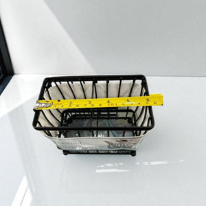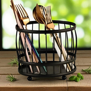 Organize your kitchen essentials with our charming Metal Utensil Rack with Two Divided Storage. This stylish caddy combines durable black metal with a clean white body, offering a rustic yet modern aesthetic. Featuring two upper compartments for sorting utensils and a convenient bottom rack, it keeps your spoons, spatulas, and other tools tidy and accessible. Perfect for adding functional charm to any kitchen countertop or dining area.