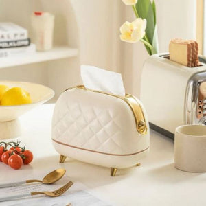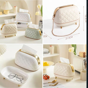 Elevate your space with our Stylish Purse Shaped Tissue Box, a perfect blend of high-fashion aesthetics and smart functionality. This unique tissue holder, resembling a chic, quilted handbag with elegant gold accents, serves as both a functional essential and a captivating decor piece.