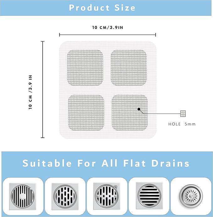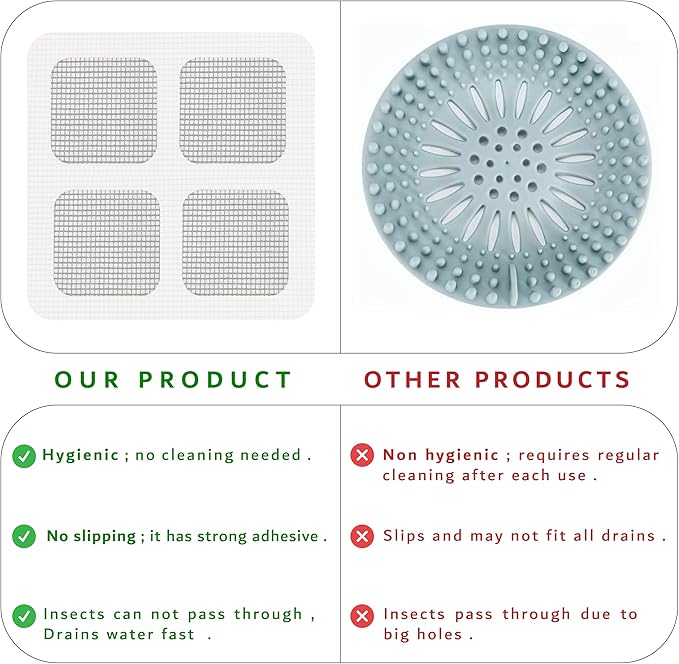 Features: our update disposable hair catcher can effectively solve floor drain and stick problems, compared with a normal hair catcher. The new hair catcher has a 0.55mm hole, it can effectively catch the hair and drain water faster at the same time.