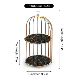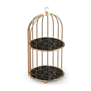 This organizer features a distinctive cage-like structure with two circular tiers, providing ample storage in a compact design. The golden metal frame, accented with small gold ball feet, creates a visually striking contrast with the black marble-look shelves. A clear, faceted finial on top adds a decorative touch, enhancing its overall appeal. The open design ensures easy visibility and access to all your stored items.
