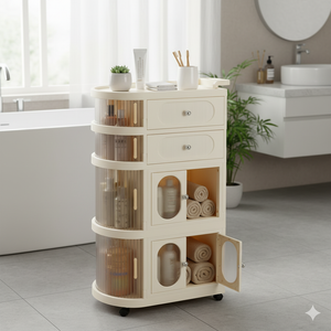 - Bottom 2 Tiers: Same size, larger height (30 cm each) with cupboard-style openings for bigger items or bulk storage
