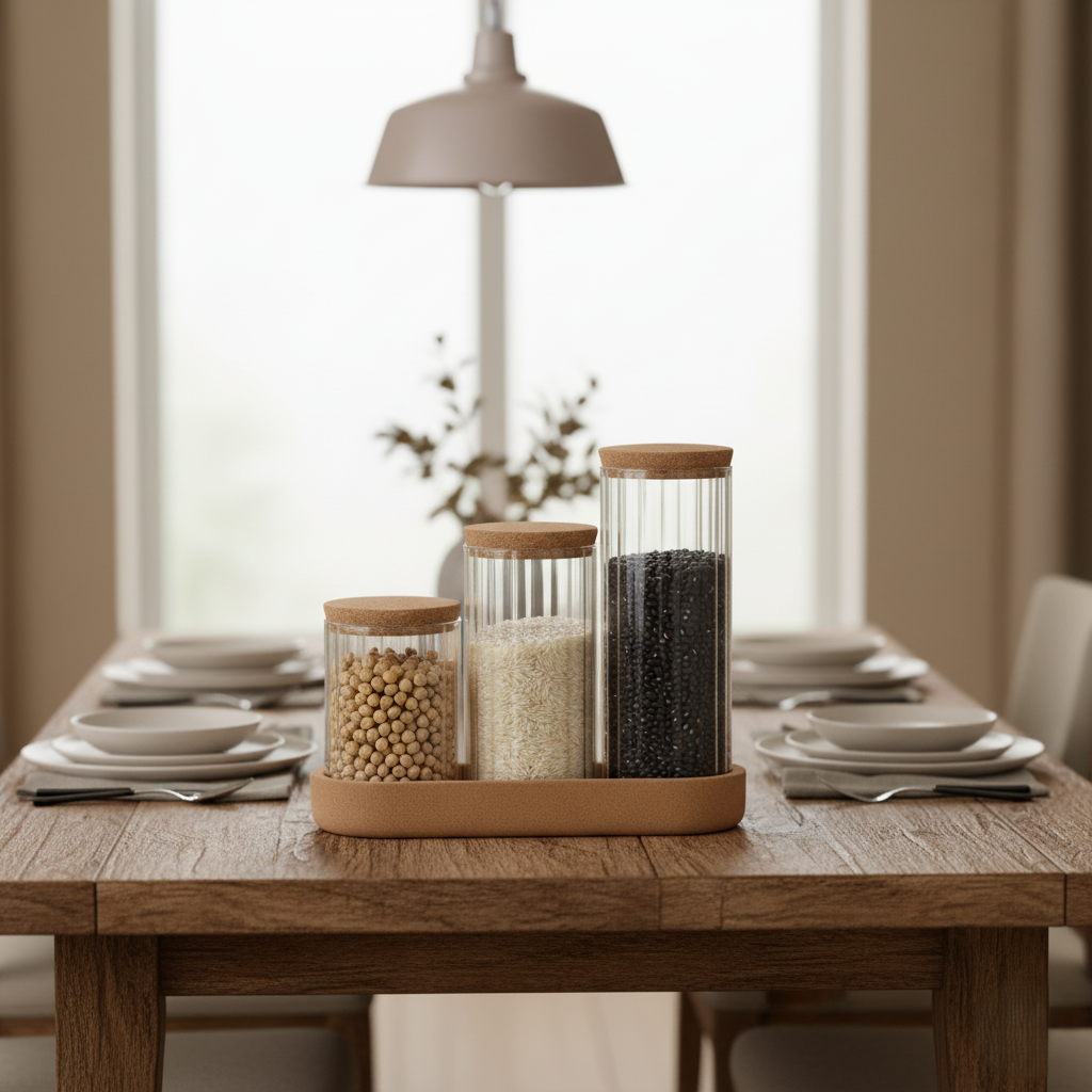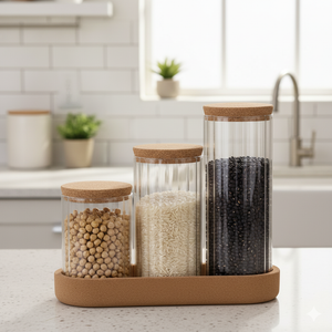 Organize your kitchen with simplicity and style using the Classic Glass Storage Jar Set with Cork Lids & Tray. This elegant set features three high-quality borosilicate glass jars with natural cork lids, beautifully arranged on a matching cork tray. Designed to combine functionality with eco-conscious aesthetics, these jars keep your ingredients fresh and visible — making them perfect for storing coffee, tea, pulses, spices, or snacks while adding a clean, minimalist look to your kitchen space.