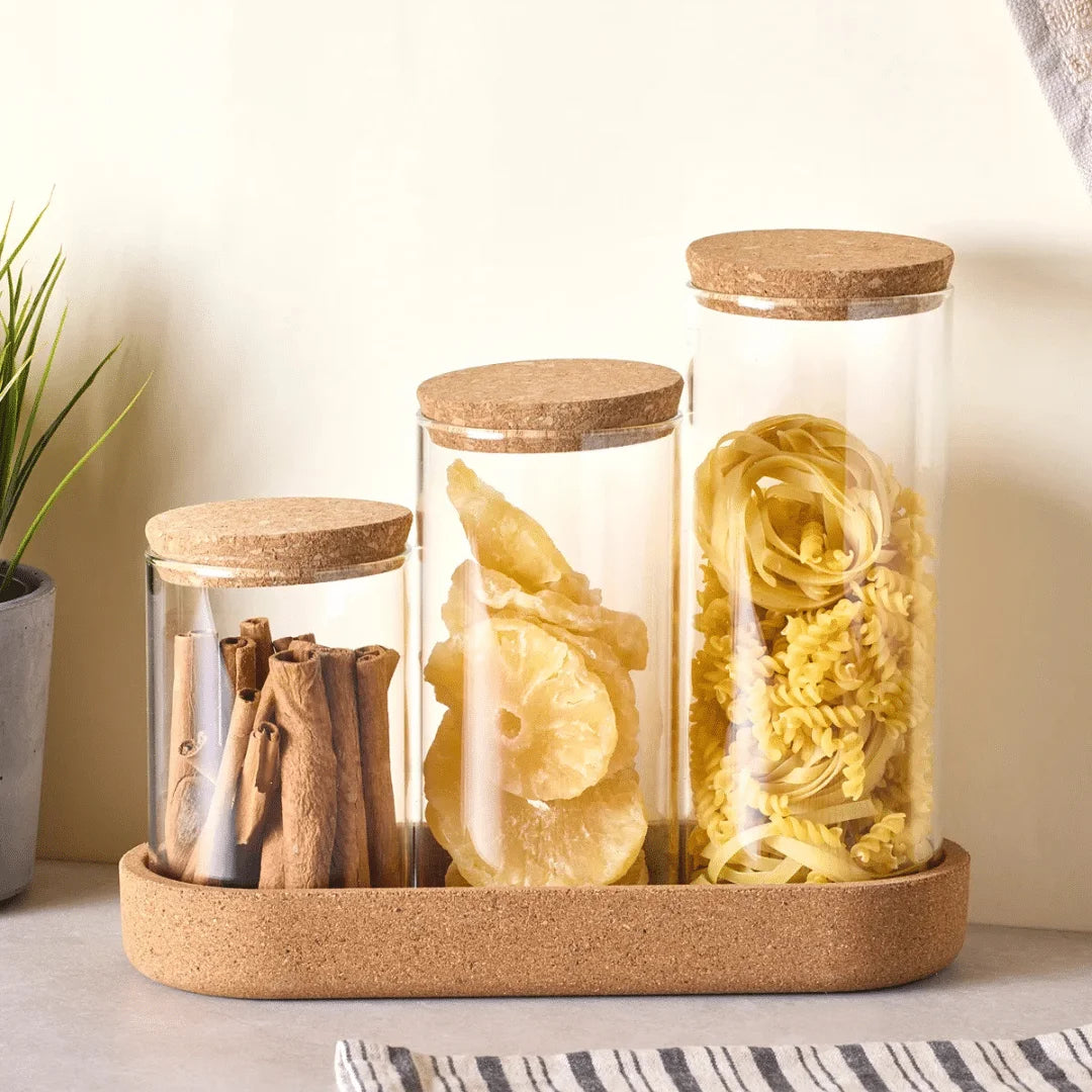 - Set Includes: 3 Glass Jars + 1 Cork Tray