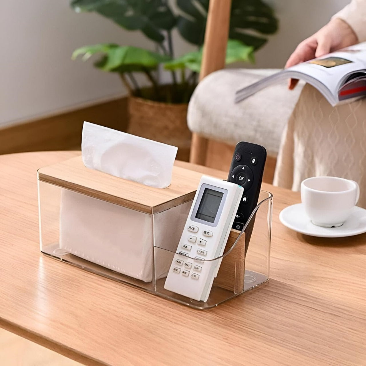 Experience everyday organization with elegance through the ClearView Wooden Lid Tissue Box with Dual Compartments. Designed with a sleek transparent body and a smooth wooden lid, this premium organizer blends functionality with modern aesthetics. Its dual-compartment layout allows you to store tissues on one side and small essentials — like remotes, pens, or accessories — on the other, keeping your space neat and visually appealing. Perfect for living rooms, bedrooms, bathrooms, or offices, it turns an everyday necessity into a refined décor accent.