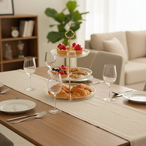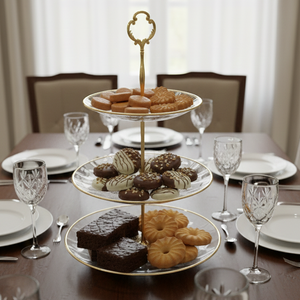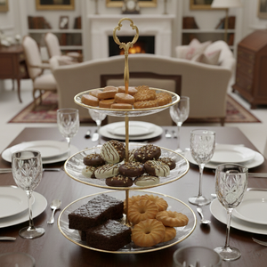 The DelightTower 3-Tier Golden Serving Stand is a stylish and functional display piece designed to elevate any table setup. Built with three clear, durable tiers and finished with a luxurious golden handle, it adds a touch of elegance to your presentation of snacks, desserts, fruits, and pastries. Lightweight yet sturdy, it is perfect for high-tea gatherings, parties, events, or simply enhancing your countertop décor. The modern clear plates paired with gold accents create a sophisticated aesthetic that complements any theme.