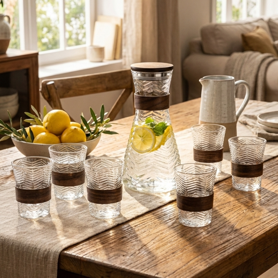 Upgrade your everyday drinkware with this PrismWave Pitcher & Glasses Set (1162), designed to combine modern style with practical functionality. Featuring a bold zigzag texture and a sleek, ergonomic shape, this tumbler is perfect for serving water, juice, cold beverages, or daily refreshments. Its durable construction ensures long-lasting use, while the contemporary chevron design adds a sophisticated touch to your dining table, kitchen, or office desk. Lightweight, easy to handle, and visually striking, it is ideal for both casual and formal settings.