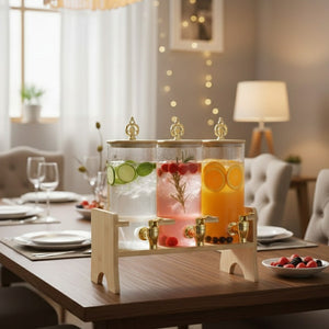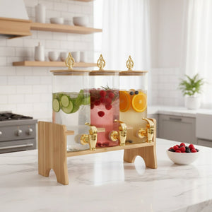 This elegant setup features three tall, clear glass dispensers securely placed on a sturdy bamboo wooden stand. Each dispenser is fitted with a smooth-flow gold-finish tap, allowing effortless pouring without spills. The decorative gold-accented lid handles add a luxurious finishing touch, making it perfect for weddings, buffets, parties, catering services, and upscale home gatherings.