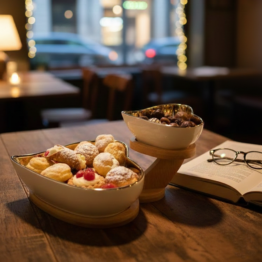 - Heart-Shaped Ceramic Bowls: Two premium glossy bowls in heart shapes for an elegant and unique presentation.