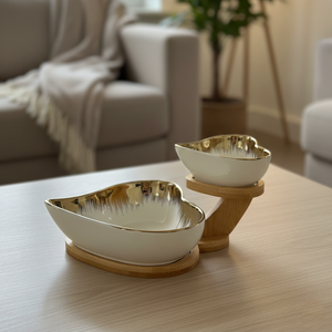 - Material: Ceramic (bowls), Natural Wood (stand)