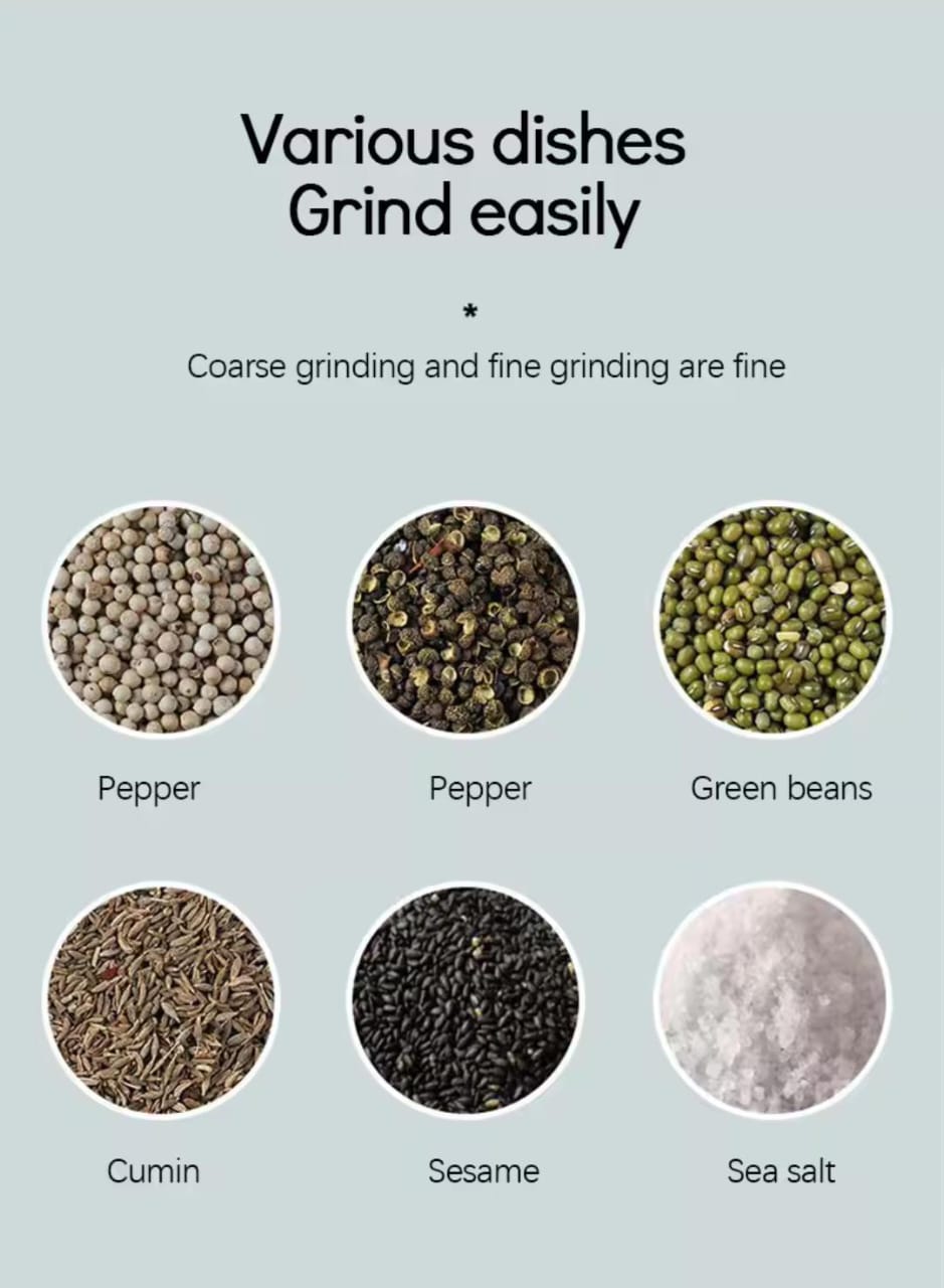Function: Grind pepper, sesame, pepper, mung bean, cumin, sea salt, etc.