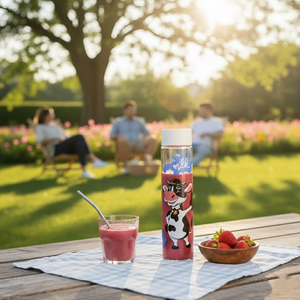 - Milk-Themed Printed Glass Bottle — cute, stylish milk print ideal for serving or storing milk and dairy-based drinks.