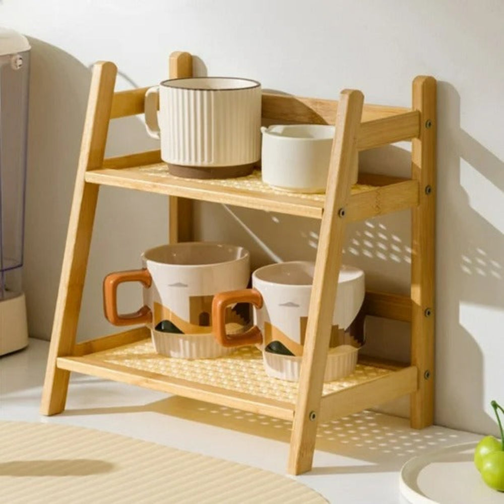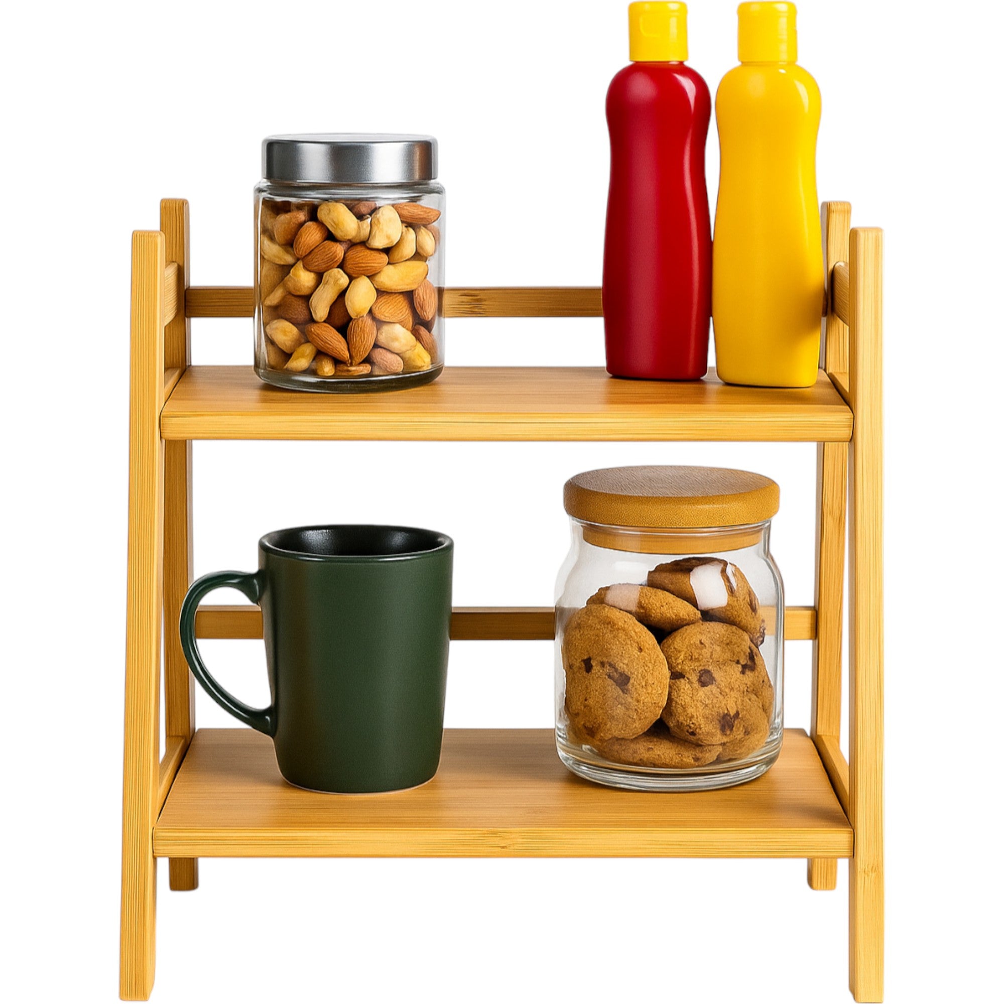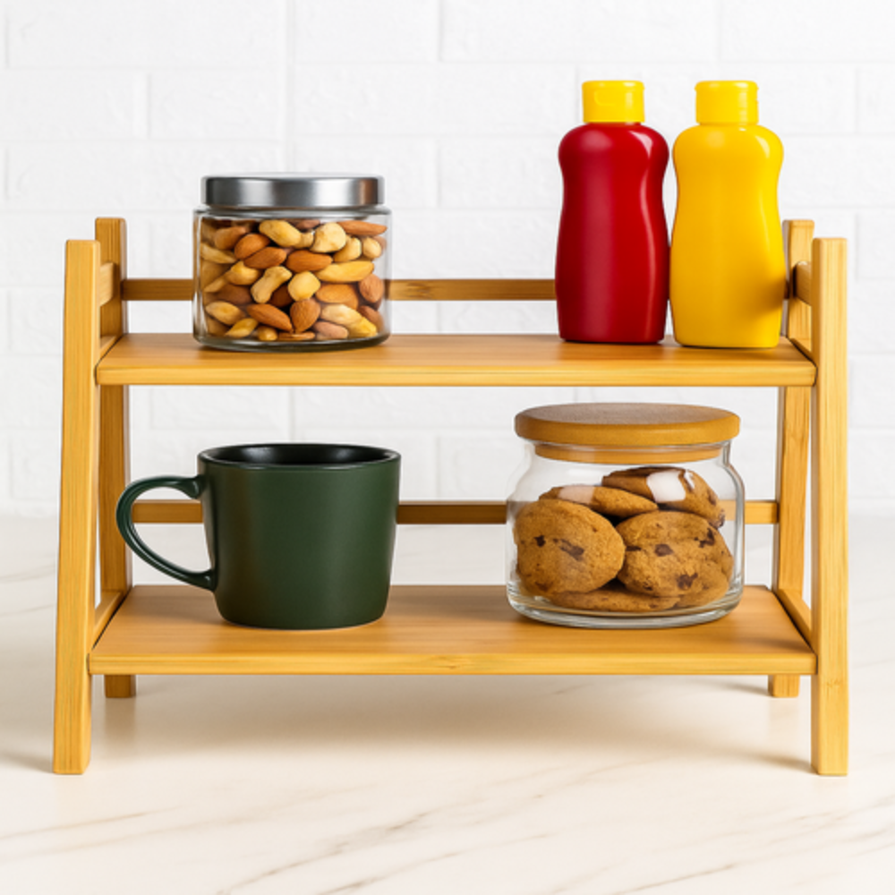 Experience the perfect blend of sophisticated design, practical layering, and sustainable materials with the 2-Tier Countertop Stratum Bamboo Shelf – an indispensable and elegant solution for organized living.