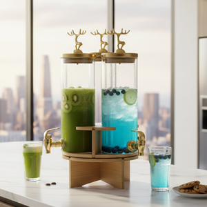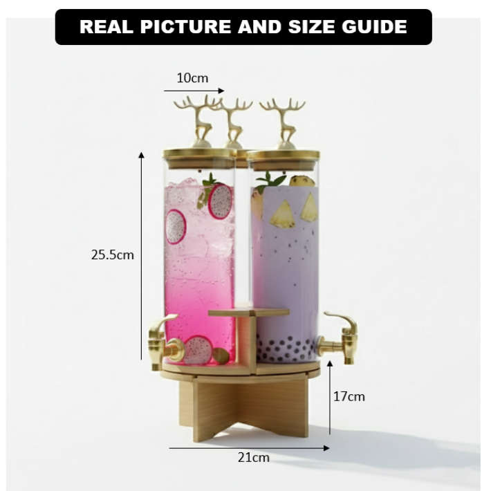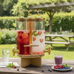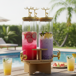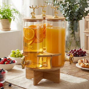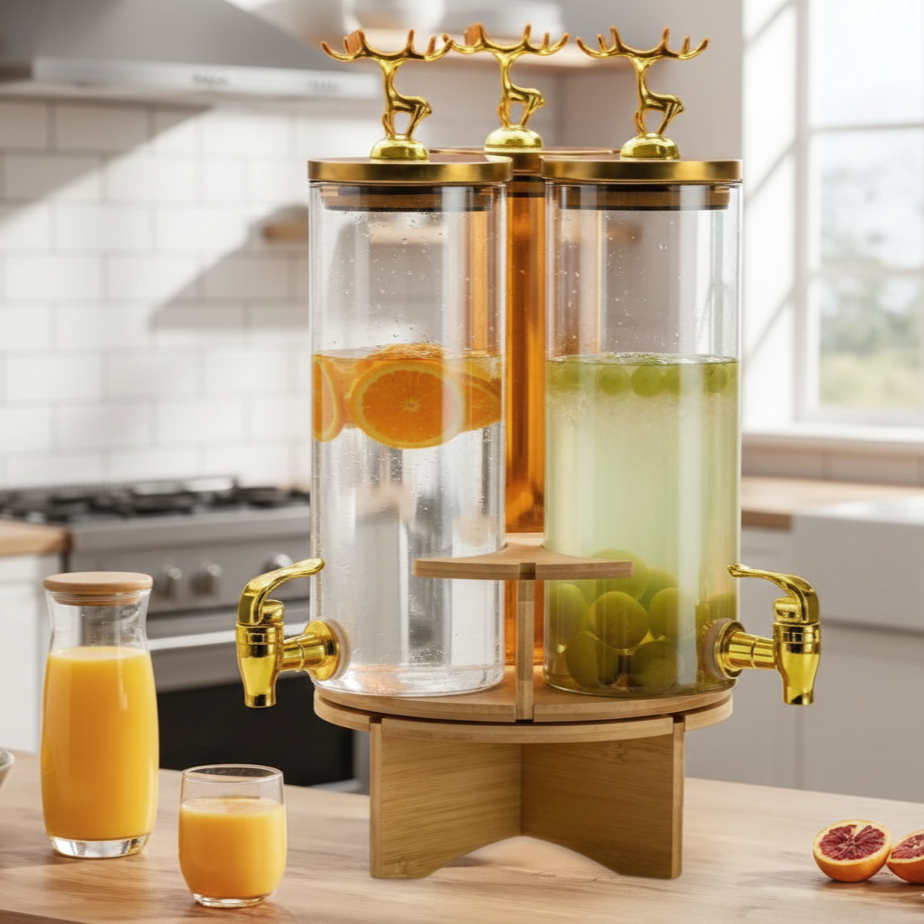 Create a stunning drink station for your home or events with this 3-Pcs TintedGlass Round Beverage Dispenser Set with Rotatable Wooden Stand (1147). Designed for both beauty and practicality, each pitcher features a clear glass body for showcasing colorful drinks, a natural wooden lid topped with an elegant deer-shaped knob, and a smooth-flow spigot for effortless serving.The matching wooden stand elevates the dispensers for easy pouring while adding a rustic-luxury touch to your table, buffet, or outdoor gathering. Perfect for serving lemonade, iced tea, juice, infused water, mocktails, or punch, this set allows you to present multiple beverages at once in a coordinated and eye-catching way.