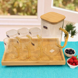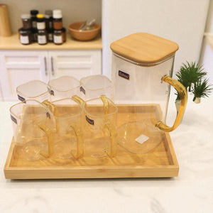 Natural Wooden Lid & Tray: The pitcher features a bamboo lid, and the set rests on a sturdy wooden tray for organized serving.