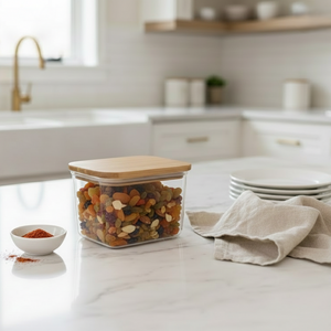 The Limon Airtight Glass Container with Wooden Lid is a small, elegant, and versatile storage jar designed for everyday kitchen use. Featuring a clear glass body for instant visibility of contents and a natural wooden lid for a stylish, warm aesthetic, this jar is perfect for storing dry goods, spices, herbs, snacks, or small food items. Its compact design makes it ideal for countertops, shelves, or cupboards, keeping your kitchen organized while preserving freshness.