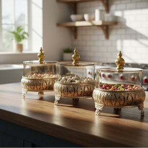 Redefine your home elegance with the Exquisite 3-Piece Golden Base Glass Jars with Lid — a luxurious blend of sophistication and functionality. Designed with golden-tinted glass and a sleek metal base, these jars not only store your essentials but also serve as beautiful countertop décor. Ideal for organizing dry goods, snacks, coffee, or decorative items, this premium set adds a refined touch to your kitchen or dining area.