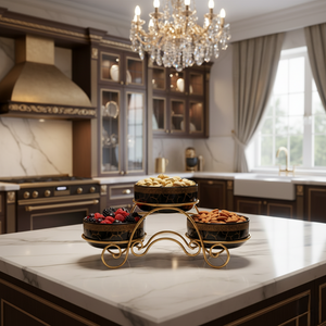 Elevate your dining and serving experience with the Royal Ceramic Jar Trio with Golden Stand. Featuring three glossy ceramic bowls held elegantly on a sturdy golden metal stand, this set blends style and functionality effortlessly. Perfect for serving salads, fruits, snacks, desserts, or side dishes, it turns everyday meals into a refined, curated presentation.