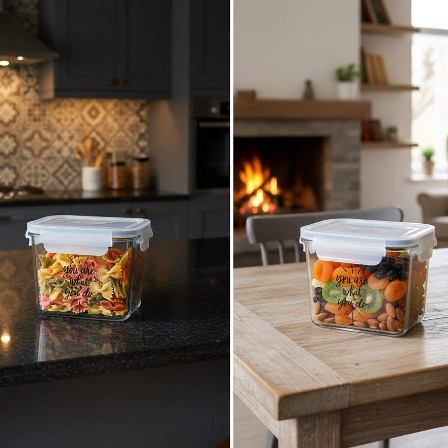 The Printed Glass Container with Airtight Lid (2227) by Limon is a durable, transparent food-storage solution designed to keep ingredients, leftovers, and meal-prep items fresh for longer. Its high-quality glass body prevents stains and odors, while the secure airtight plastic lid seals out air, moisture, and dust. Ideal for fridge, freezer, or pantry storage, this container offers a clean, practical, and multipurpose option for everyday kitchen use.