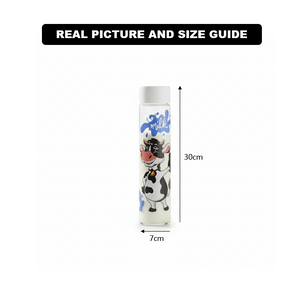 • Milk-Themed Printed Glass Bottle — cute, stylish milk print ideal for serving or storing milk and dairy-based drinks.